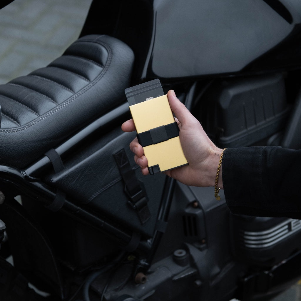 Our most premium cardholder, built for slim carry and quick access. For the first time ever, we’ve added a reinforced stainless steel button to this 18-karat Gold wallet. Enjoy easier card access and more durability than ever before. Store your most important cards in the main RFID-blocking compartment, with room for extra cards in the expandable backplate.